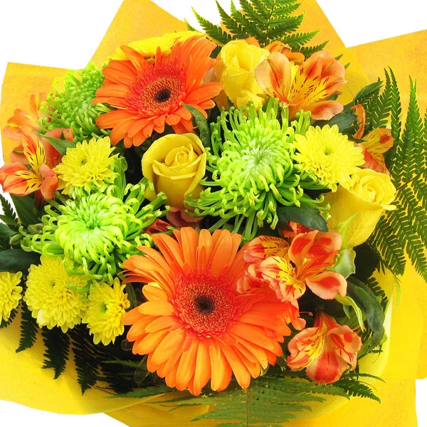 Стандартный: гербера оранжевая - 2 шт., роза желтая (60 см) - 3 шт., хризантема кустовая желтая - 2 шт., альстромерия оранжевая - 3шт., хризантема зеленая (шамрок) - 3 шт., декоративная зелень, фетр желтый.
