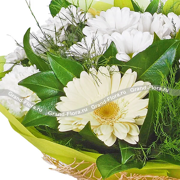 Стандартный: гербера кремовая - 5 шт., гвоздика белая - 4 шт., хризантема кустовая белая - 2 шт., декоративная зелень, фетр зеленый, ротанг бежевый, бант кремовый.