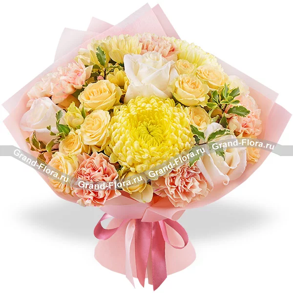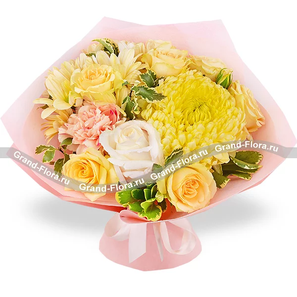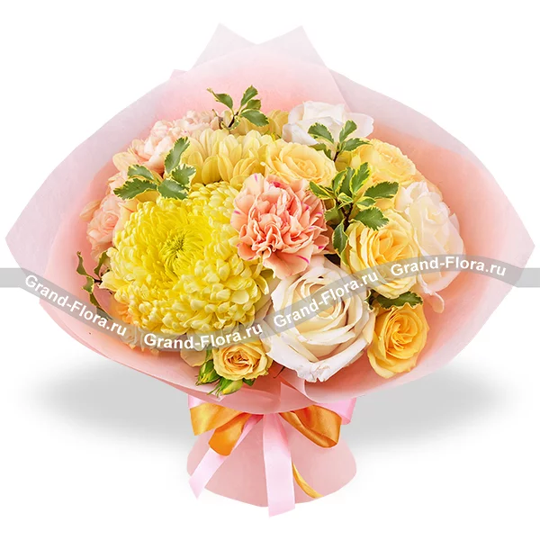 Стандартный: хризантема шамрок желтая - 1 шт., роза белая - 3 шт., хризантема кустовая ромашковая желтая - 1 шт., гвоздика персиковая - 3 шт., роза кустовая желтая - 1 шт., декоративная зелень, упаковка, лента.