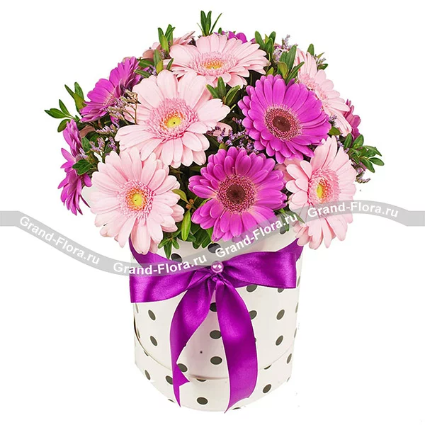 Стандартный: гербера малиновая - 10 шт., гербера розовая - 9 шт., декоративная зелень, коробка (цвет и форма могут отличаться от изображения), лента.