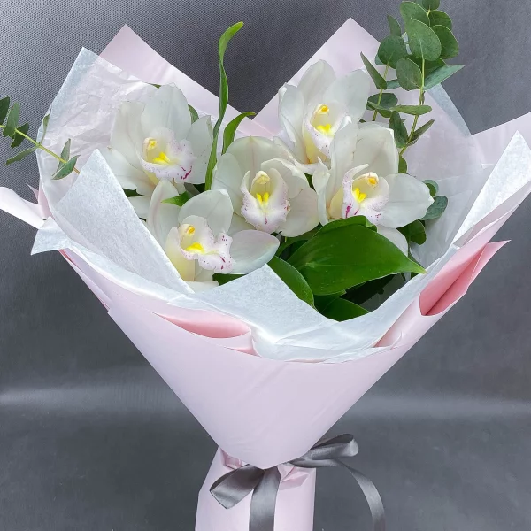 Стандартный: орхидея белая - 5 бутонов, эвкалипт, упаковка.